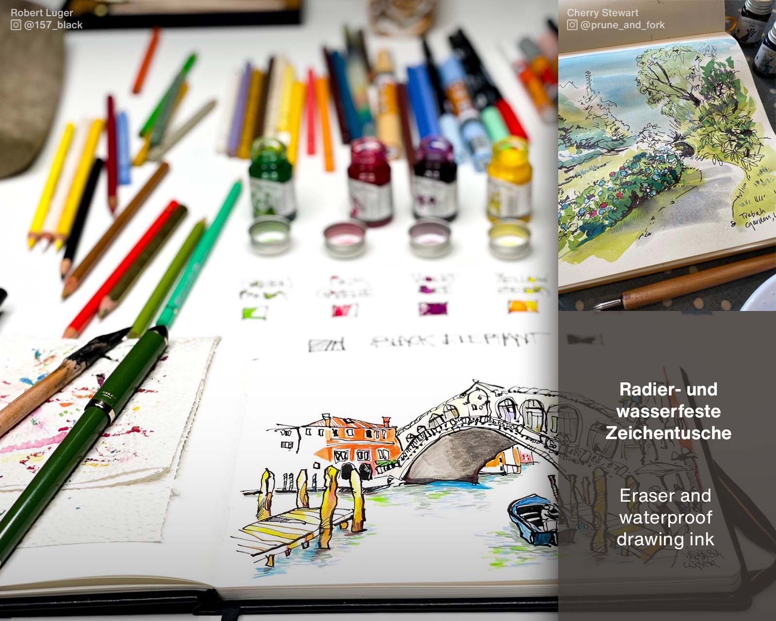 Writing enthusiasts love the razor-sharp typeface, which can be achieved on paper suitable for fountain pens, and the pleasant shading of the Write & Draw writing ink. The calligrapher succeeds in creating the finest hairlines and impressive flourishing elements, and the urban sketcher creates precise outlines. The ink or tusche dries waterproof